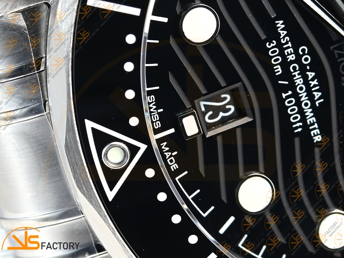 The VS Factory Omega Seamaster Diver 300M features a sleek black ceramic bezel and matching black dial, encased in a 42 mm stainless steel case with a polished steel bracelet. Powered by the VS8800 movement, this edition offers master‑grade chronometric precision and a 55‑hour power reserve. Professional dive credentials include 300 m water resistance, a helium escape valve, and a unidirectional rotating bezel for accurate underwater timing. Bold luminous markers and Omega’s signature wave‑pattern dial deliver outstanding legibility and style. Combining advanced materials with iconic design, this timepiece is perfect for divers and collectors seeking both performance and elegance.