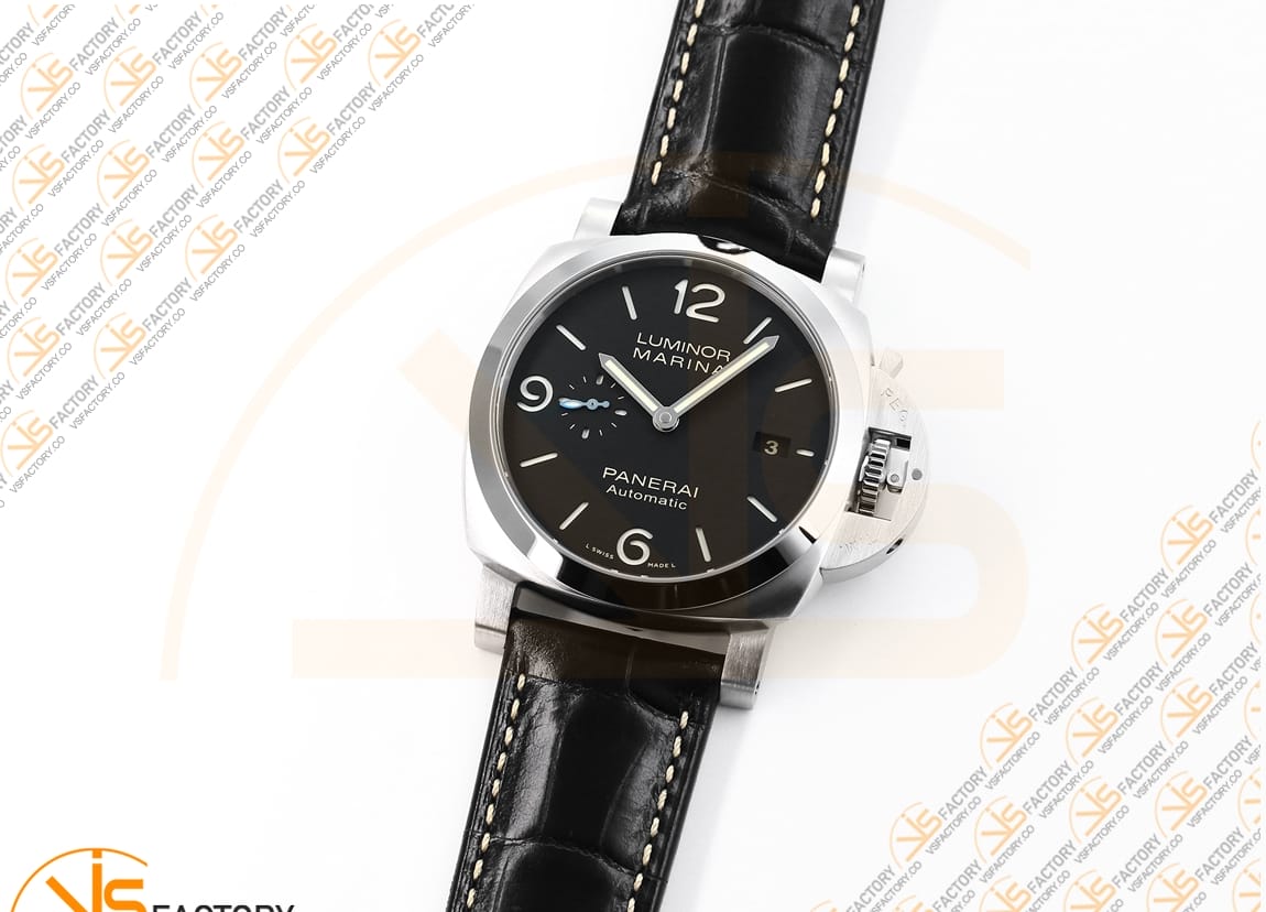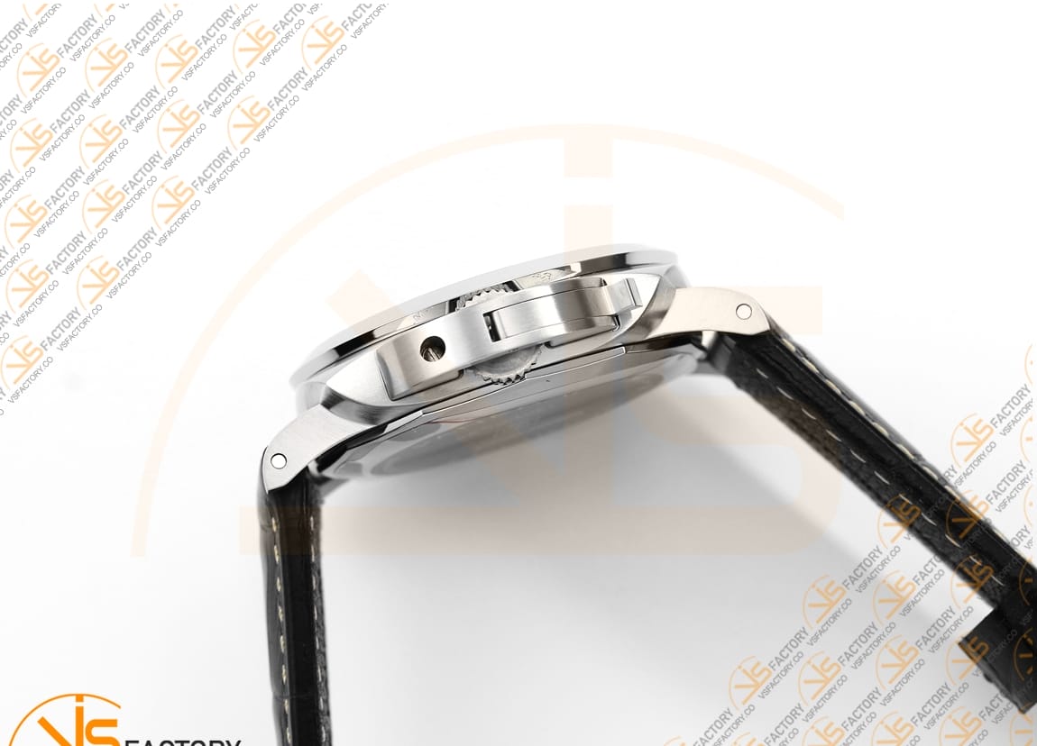 The VS Factory Panerai Luminor Marina PAM1312 boasts a bold black dial within a classic stainless steel case, powered by the reliable P.9010 super clone movement. Its 44mm case is complemented by a black leather strap, combining elegance with rugged performance. Featuring luminous hands and markers, a small seconds subdial, and signature Luminor design, this watch is perfect for those who seek iconic Panerai aesthetics and daily versatility.