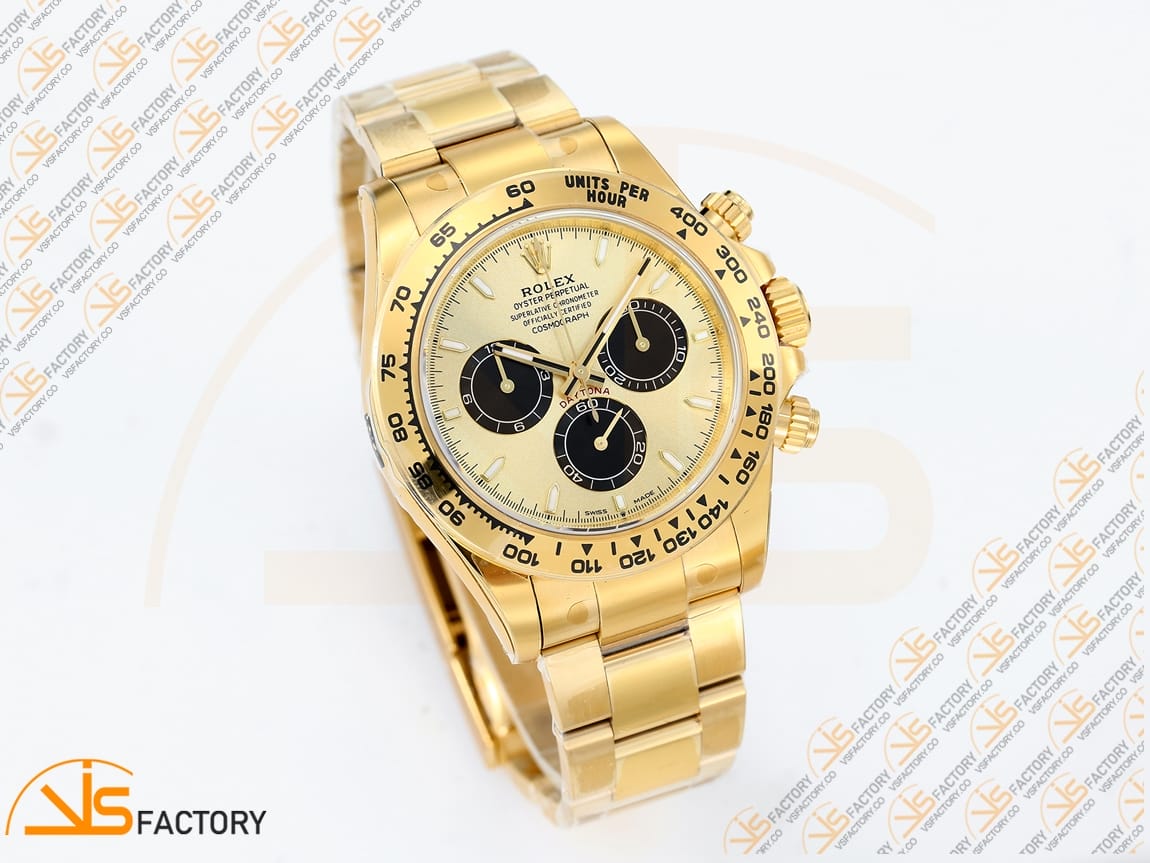 The VS Factory Rolex Daytona 126508 showcases a radiant yellow gold dial housed in a fully 18k yellow gold case and matching YG Oyster bracelet, weighted for an authentic, premium feel. Powered by the high‑performance VS4131 movement, it delivers a 72‑hour power reserve and precise chronograph functionality. Featuring a black Cerachrom bezel with engraved tachymeter scale, this model enables accurate speed measurements for motorsport timing. Screw‑down pushers and a Triplock crown ensure 100 m water resistance, while the iconic Daytona subdials and robust build blend luxury and professional performance. A statement piece that epitomizes Rolex’s craftsmanship and racing heritage, the 126508 is a must‑have for collectors seeking both prestige and precision.